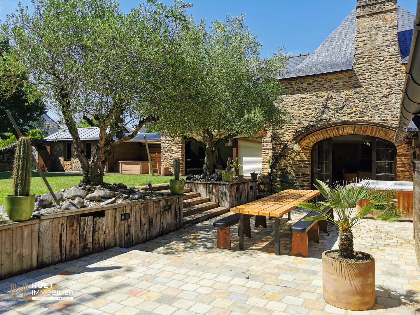BRUZ - Idéalement située, à proximité des axes routiers, de l'aéroport et de la gare, vous serez très vite sous le charme de cette magnifique propriété de 185 m² construite en pierres sur un terrain de 1 176 m². Elle vous accueille dans un confort authentique avec ses sols en terre cuite et sa cheminée ancienne. Elle se compose au rez de chaussée d'une pièce de vie de 35 m2, et un salon de 22 m² offrant un espace agréable et chaleureux donnant accès à la terrasse, une chambre avec salle d'eau et mezzanine, une cuisine équipée, une buanderie et un WC. A l'étage, trois chambres dont une avec salle d'eau privative, une salle de bains, un bureau et une autre pièce au 2ème étage pouvant servir de couchage. L'extérieur vous invite à profiter pleinement d'une très belle terrasse avec jacuzzi, un four à pain, et un bassin avec cascade. Un grand garage, une cave et une annexe viennent compléter cette propriété. Chauffage fioul. Prix de vente 786 600 € comprenant les frais d'agence de 3,50 % TTC à la charge des acquéreurs. Prix hors honoraires : 760 000 € CLASSE ENERGIE : D / CLASSE CLIMAT : D Montant moyen estimé des dépenses annuelles d’énergie pour un usage standard, établi à partir des prix de l’énergie de l’année 2021: entre 1 920 € et 1 650 €. Pour tout renseignement, merci de contacter Michel Huet au 06 15 73 51 34 ou par mail à m.huetimmobilier@gmail.com, agissant sous le statut d'agent commercial indépendant auprès de l'agence HUET IMMOBILIER immatriculé au RSAC de Rennes sous le numéro 349 696 781.