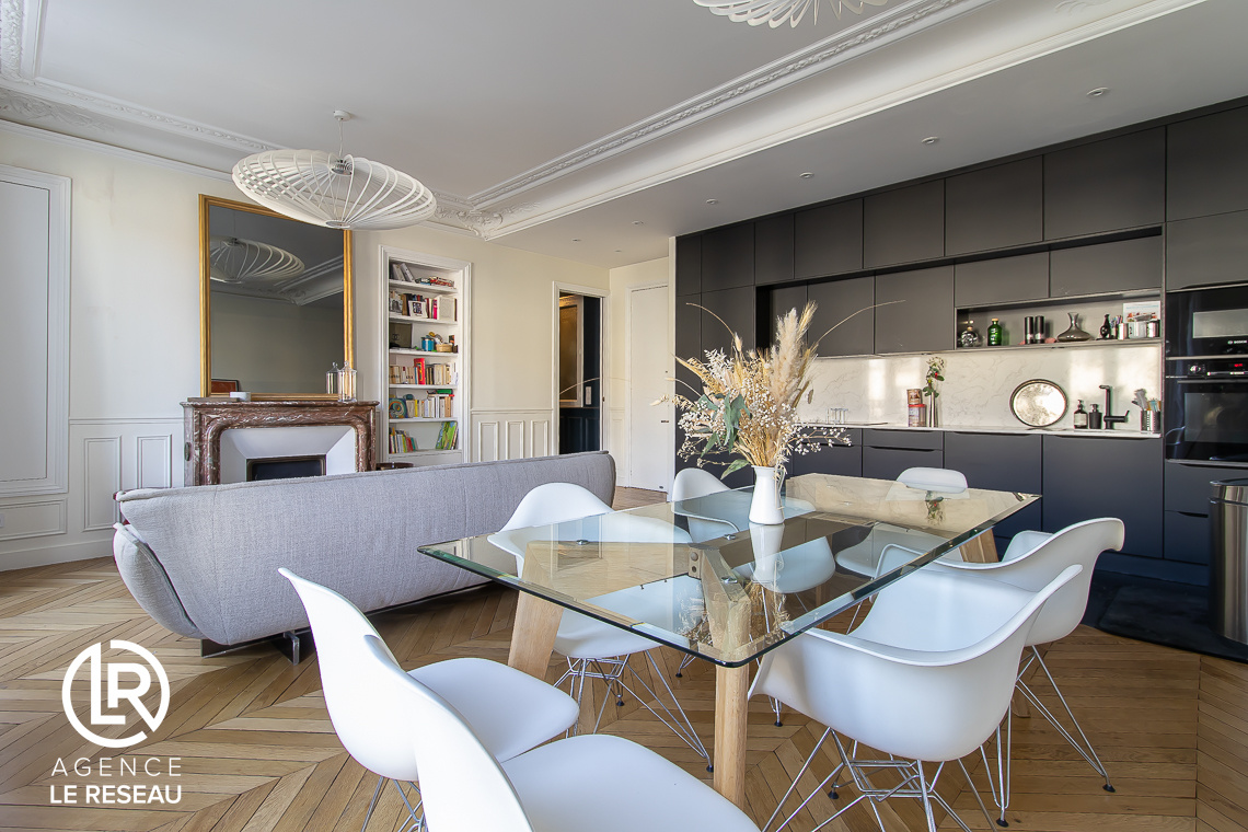 Centre ville. L'Agence Le Réseau avec une commissions fixe de 7 500€ vous propose à la vente cet appartement familial de 104m² (103.89m² loi Carrez), situé Avenue Edouard Vaillant dans un bel immeuble en pierre de taille de 1910, en plein centre ville à 100m de la gare de Pantin et proche de la Mairie. Cet appartement entièrement rénové par architecte est au 2ème étage et se compose, d'une entrée avec rangements, d’un double séjour avec cuisine américaine équipée, le tout faisant une surface de 36m² donnant sur le balcon filant, de 3 chambres avec rangements dont une grande suite parentale avec sa salle de bains avec WC et douche à l'italienne, d’une salle d’eau et un WC séparé. De conception moderne ce bien a bénéficié d'une rénovation complète, (parquet, électricité, plomberie, fenêtres en double vitrage et de nombreux rangements). Le bien bénéficie également d'une belle hauteur sous plafond, de parquet massif, de moulures, de cheminées et de nombreux rangements sur mesure. Les charges, de 260 euros par mois, incluent notamment l’eau froide et l’entretien des parties communes. Le chauffage et l’eau chaude sont individuels et électriques. La taxe foncière est de 1800 euros. Le prix de vente est de 737 500€ incluant 7 500€ d'honoraires d'agence soit 730 000€ hors honoraires d'agence soit 1.70% à la charge de l'acquéreur